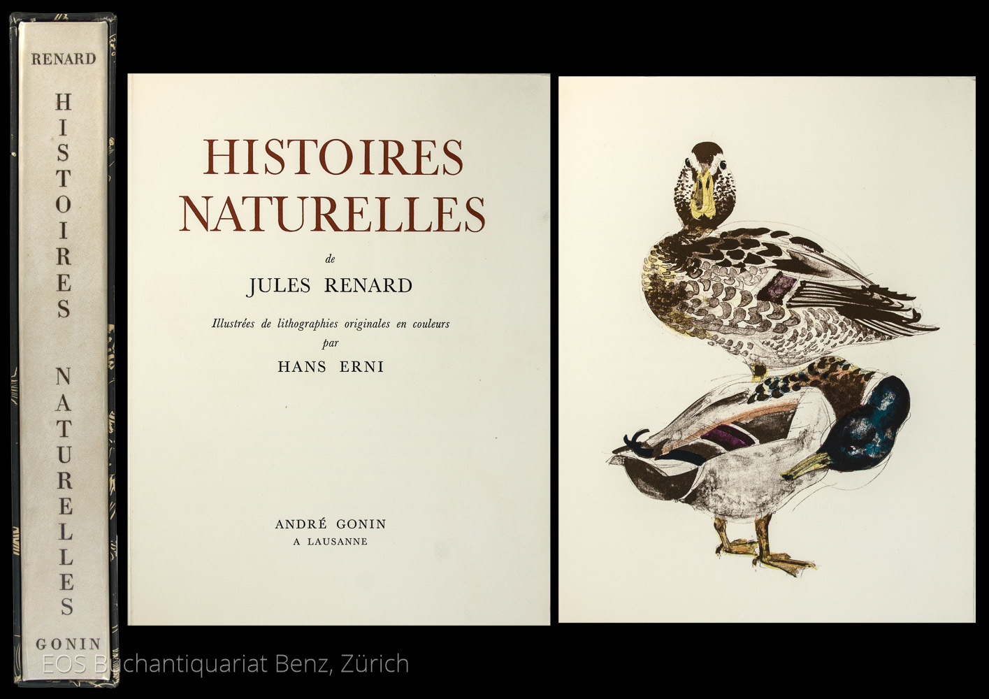 Erni.- Renard, Jules: Histoires naturelles. Lausanne, André Gonin, 1953. Gross-4°. 207, (4) S. Mit 29 ganzs., farb. lithogr. Illustrationen von Hans Erni. Lose Bogen in lithogr., brosch. Orig.-Umschlag u. illustr. Orig.-Halbpergament-Chemise in illustr. Orig.-Pappschuber