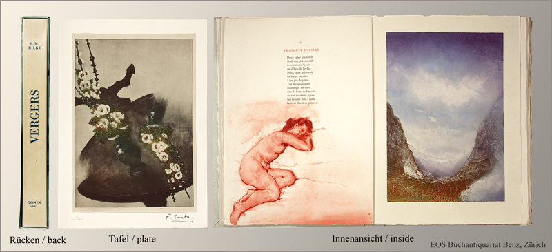 Sarto.- Rilke, Rainer Maria: Vergers. Seize aquatintes originales de Pietro Sarto. Lausanne, Pierre Gonin, 1993. Gross-4°. (2) S., (1) Bl., (44) S. Mit 9 ganzs. farb. Aquatinta-Tafeln u. 7 Textillustr. in Aquatinta nach Pietro Sarto und 1 zusätzl. von Sarto handschriftl. signierten Aquatinta-Tafel. Lose Bogen in brosch. Orig.-Umschlag in Orig.-Halbpergament-Chemise in Orig.-Pappschuber (Schuber minim berieben).