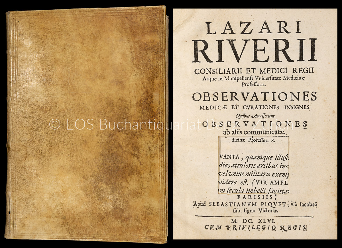 Rivière, Lazare: Observationes medicae & curationes insignes. Quibus accesserunt observationes ab aliis communicatae. Paris Seb. Piquet, 1646. 8°. (12), 253, 110, (2) S. Pergamentband aus der Zeit.