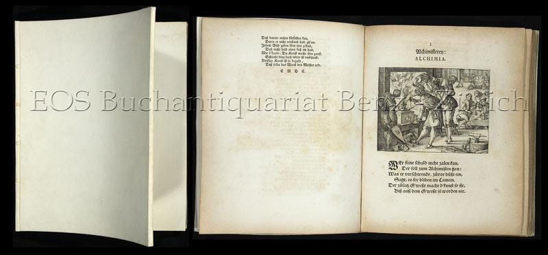 Lonchamp 2531. – Seltener, mit den erhaltenen Kupferplatten gedruckter Nachdruck, der erstmals 1622 erschienenen Kupfer von Christoph Murer (1558–1614). Die 40 Platten ursprünglich zur Illustration der dramatischen Komödie «Von den Drangsalen der christlich-edessenischen Kirchen in Mesopotamien» gedacht, wurden vor der Drucklegung durch die Zensur verboten und acht Jahre nach Murers Tod durch den Zürcher Johann Heinrich Rordorf (1591–1680) zu Emblemen umfunktioniert, das heisst mit moralisierenden Versen und Titeln versehen und danach publiziert. Murer, bekannt als der Schöpfer des Murer-Stadtplanes, stammte aus Zürich und war «die bedeutendste Erscheinung unter den Zürcher Buchillustratoren dieser Epoche» (Leemann-van Elck). Er war ein Patenkind Christoph Froschauers und über mehrere Jahre hinweg Mitarbeiter in Tobias Stimmers Strassburger Offizin. «Diese bedeutende, trefflich gezeichnete und gestochene Bilderfolge … zeugt von der sich vollzogenen Entwicklung Murers, die von der niederländischen Kunst beeinflusst ist» (Leemann-van Elck). – Durchgehend leicht stockfleckig. Pergamentband verzogen.