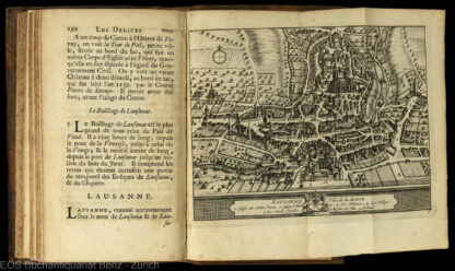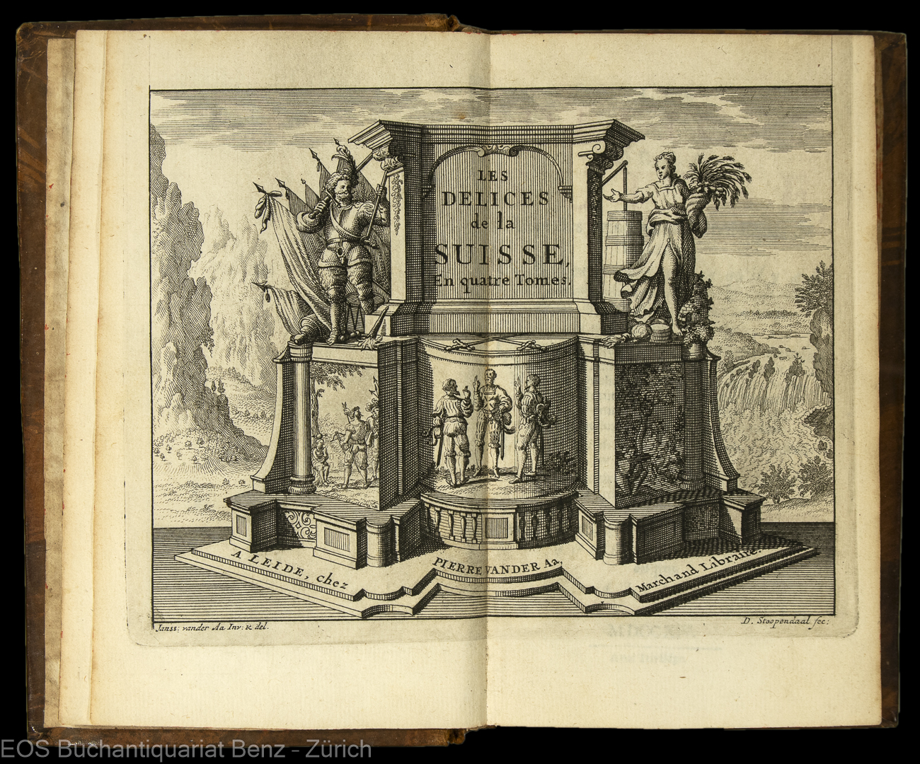 Ruchat, Abraham: Les délices de la Suisse, une de principales républiques de l’Europe. Ou l’on peut voir tout ce qu’il y a de plus rémarquable dans son pays & dans celui de ses alliez, qui composent avec elle le louable corps helvetique. Comme la description des villes, bourgs, châteaux, les antiquitez du pays & les raretez de la nature, la qualité de l’air & terroir, le naturel, les moeurs, & la religion des habitans, leurs gouvernemens différens, leur alliances ces mutuelles, & leur intérêts communs… Leiden, Pierre van der Aa, 1714. 4 Bände. Kl.-8°. (18) Bl., 220 (recte 224) S.; (2) Bl. S. 221–228, 233–434; (2) Bl. S. 435–676; (2) Bl., S. 677–1027. Mit gest. Titelblatt (doppelblattseitig), 1 gest. Frontispiz (doppelblattseitig), 68 (davon 50 gef.) und 5 (von 6) gef. Kupferkarten. Lederbände der Zeit mit reicher Rückenvergoldung.