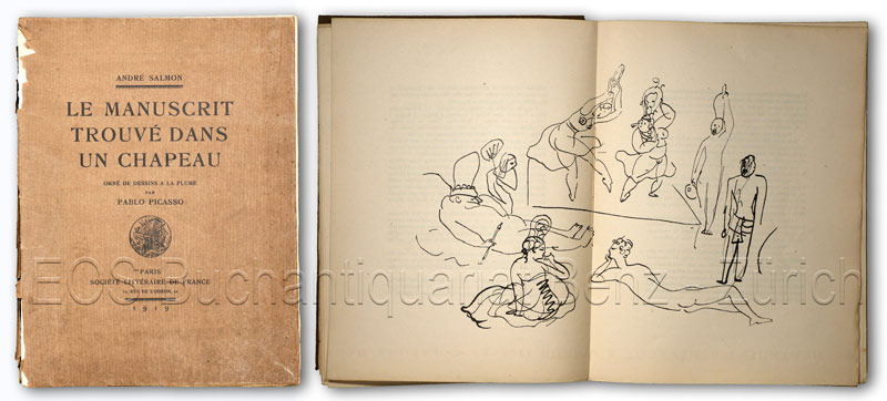Picasso. – Salmon, André:  Le manuscrit trouvé dans un chapeau. Orné de dessins à la plume par Pablo Picasso. Paris, Société littéraire de France, 1919. 4°. 114 S., 2 Blatt. Mit zahlreichen Textillustrationen. Original-Broschur.
