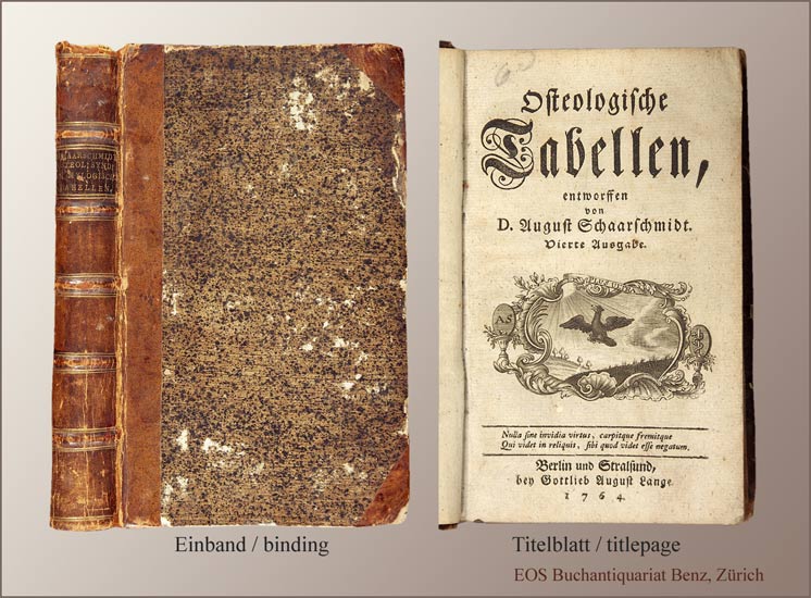 Vgl. Hirsch V, 199/120. – Neben den vorliegenden Schriften, die erstmals 1746, 1752 u. 1747 erschienen, gab August Schaarschmidt (1720-1791) während seiner Zeit als Prosector am anat. Theater Berlin die splanchnologischen, neurologischen u. adenologischen Tabellen heraus. In Mecklenburg eröffnete er eine Hebammenschule u. verfasste neben den anatomischen Schriften Werke über die Onkotomie, Arzneimittel u. Kurmethoden. – Vorsätze leimschattig. Durchgehend gebräunt. – Einbandgelenke spröde.