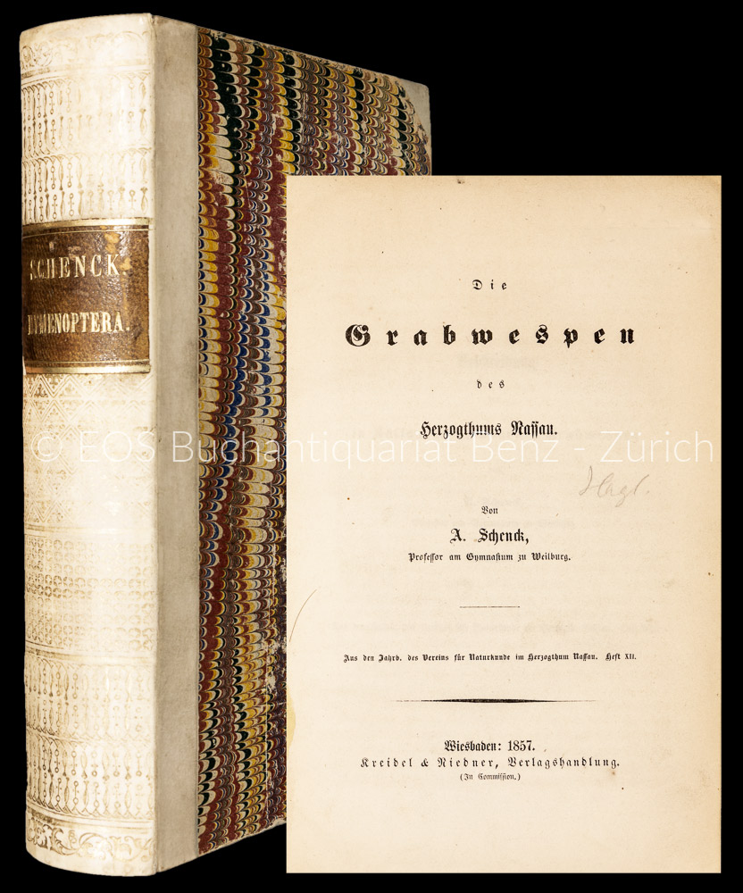 Schenck, Adolf:  Die Grabwespen des Herzogthums Nassau. – (II:) Die deutschen Vespairen. Nebst Zusätzen und Berichtigungen zu der Bearbeitung der nassauischen Grabwespen … – (III:) (IV:) Zusätze und Berichtigungen zu der Beschreibung der naussauischen Grabwespen … – Die Bienen des Herzogthums Nassau. Wiesbaden, Kreidel & Niedner und Julius Niedner, 1857, 1861. 4 Titel in 1 Band. 8°. (1) Bl., 343 S. Mit 2 Tafeln; (2) Bl., 136 S.; S. 137–208; (2) Bl., 416 S., (4) Bl. Halbpergamentband der Zeit mit Rückenschild, Rückenvergoldung und Buntpapierbezug.