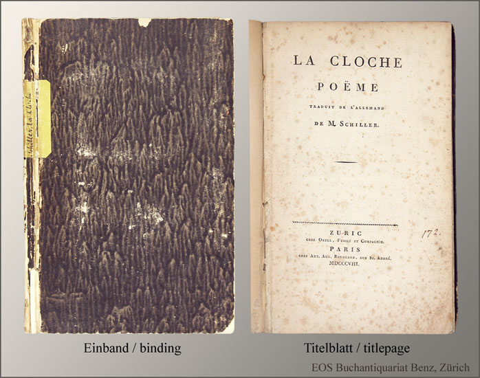 Schiller, Friedrich von: La cloche. Poëme, traduit de l’allmand. Zürich u. Paris, Orell Füssli u. Ant. Aug. Renouard, 1808. 8°. XII, 56. Mit 2 Aquatinat-Tafeln. Pappband der Zeit. (berieben und bestossen).