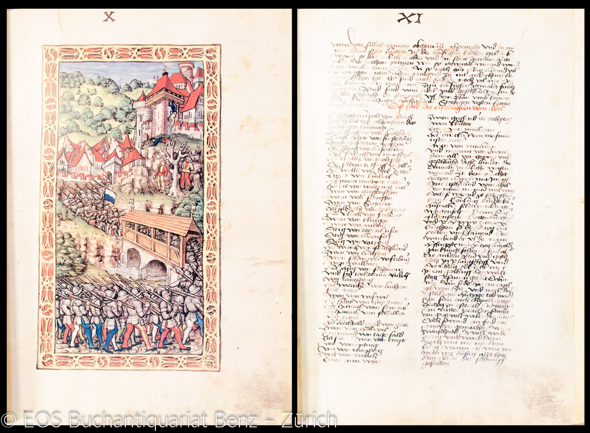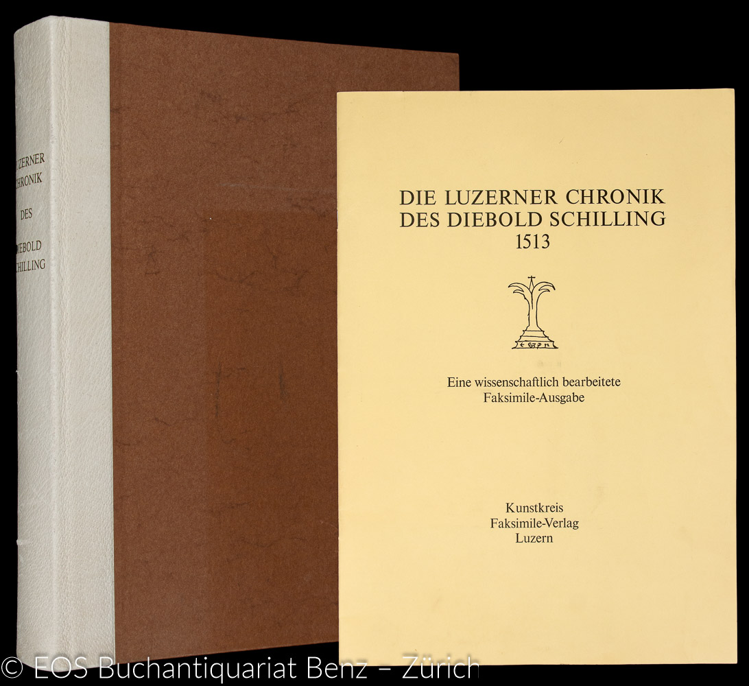 Schilling, Diebold: Die Luzerner Chronik des Diebold Schilling 1513. Luzern, Faksimile-Verlag, 1977-1981. Faksimile-Ausgabe. 2 Bände. Folio. (682) S. davon 443 Seiten mit farb. Miniaturen; 724 S. (Kommentarband). Begleitheft in Fotokopie. Schweinslederband mit Blindprägung, 2 Schliessen u. 10 Beschläge, in Holzkiste.