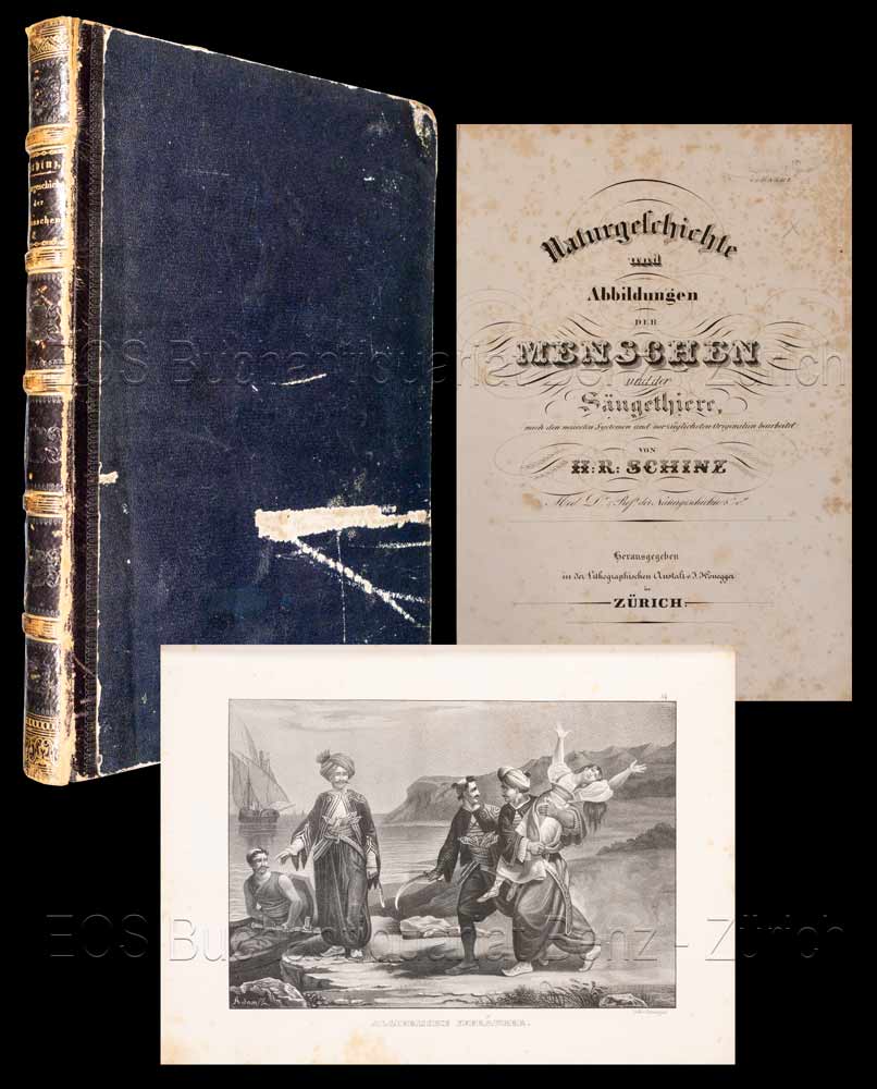 Schinz, Heinrich Rudolf:  Naturgeschichte und Abbildungen der Menschen und der Säugethiere nach den neuesten Entdeckungen und vorzüglichsten Originalien bearbeitet. Zürich, Honeggersche lithographische Anstalt, (um 1840). Text- und Tafelband in 1 Band. Folio. 124 S. Mit 63 lithogr. Tafeln. Halblederband der Zeit.