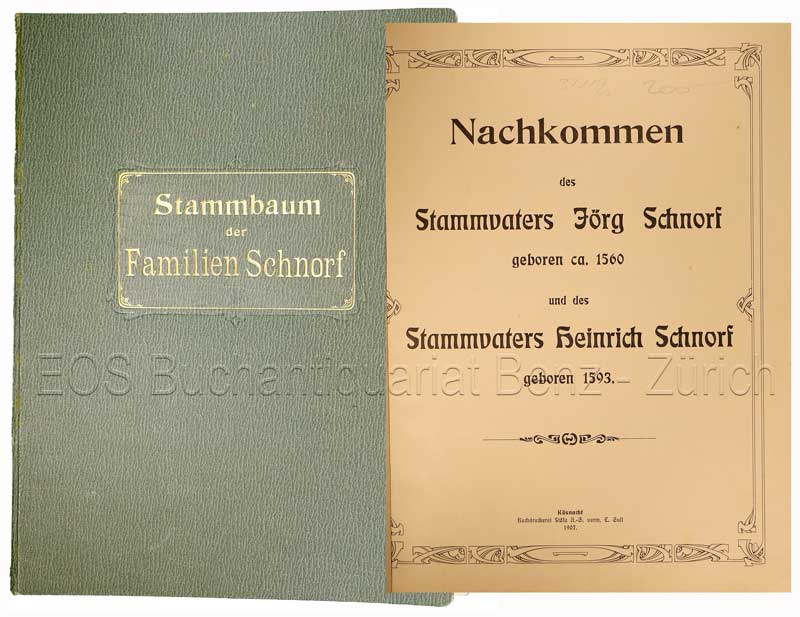 Schnorf, Rudolf: Nachkommen des Stammvaters Jörg Schnorf, geboren ca. 1560, und des Stammvaters Heinrich Schnorf, geboren 1593. Küsnacht, 1907. 4° (18) Bl. Mit div. Beilagen. Orig.-Leinenband.