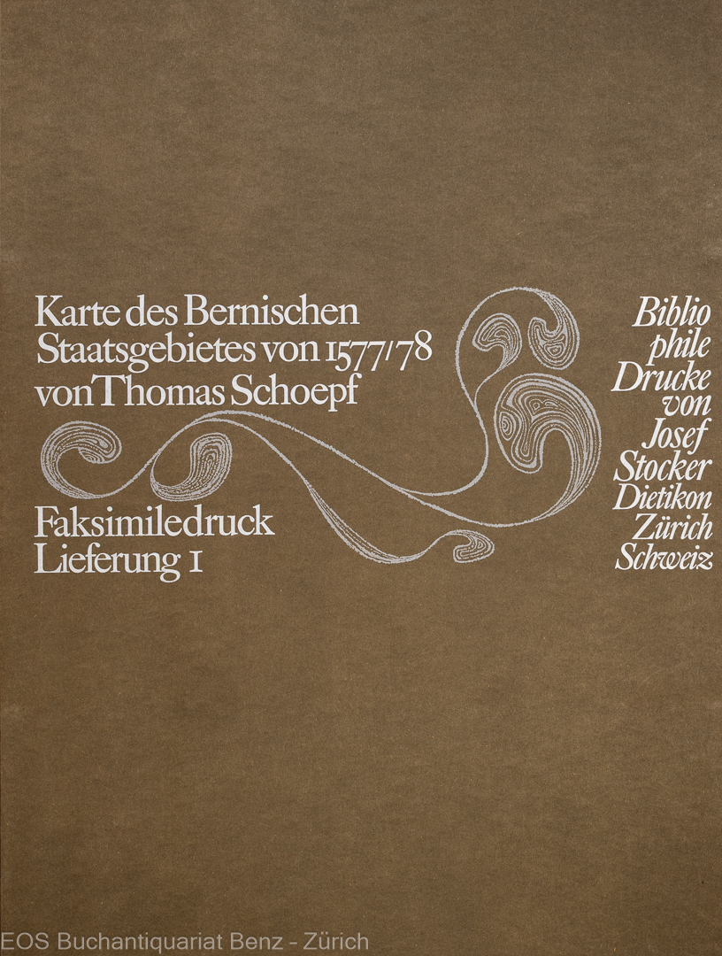 Schoepf, Thomas;  Karte des bernischen Staatsgebietes von 1577/78. Faksimiledruck nach 2 Originalen der Burgerbibliothek Bern und der Zentralbibliothek Zürich. Neugedruckt über die Kupferplatte. Herausgegeben von Georges Grosjean. Josef Stocker, Dietikon. 1970–1972. Folio. Übersichtsblatt der 18 Einzelblätter, 22 Bl., 3 Schriftblätter und 18 Einzelblätter. Orginalbroschurdecken und Halbleinenmappe. Bibliophile Drucke von Josef Stocker.