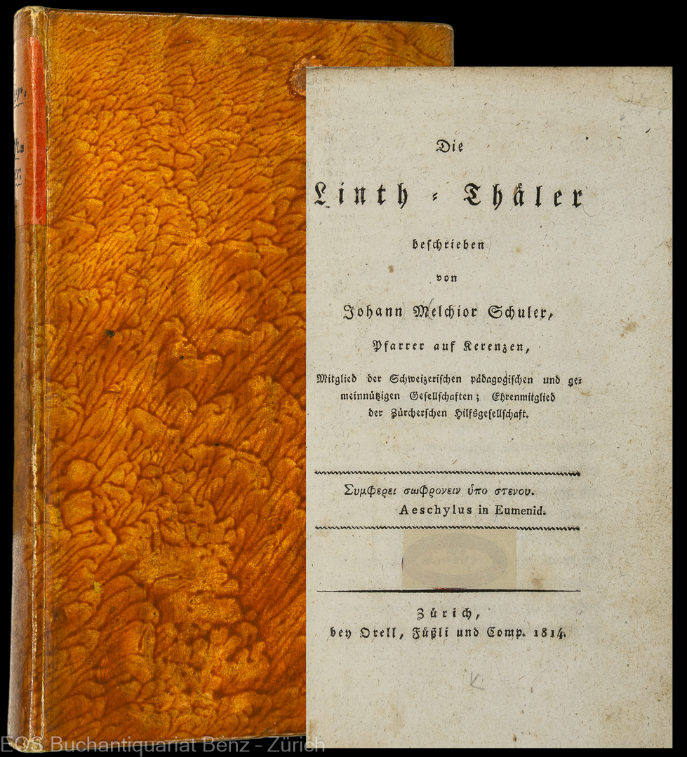 Schuler, Johann Melchior: Die Linth-Thäler. Zürich, bey Orell, Füssli und Comp., 1814. 8°. XVI, 296, (6) S. Mit 1 gef. Karte und 1 gef. Tabelle Pappband der Zeit handschr. Rückenschild.