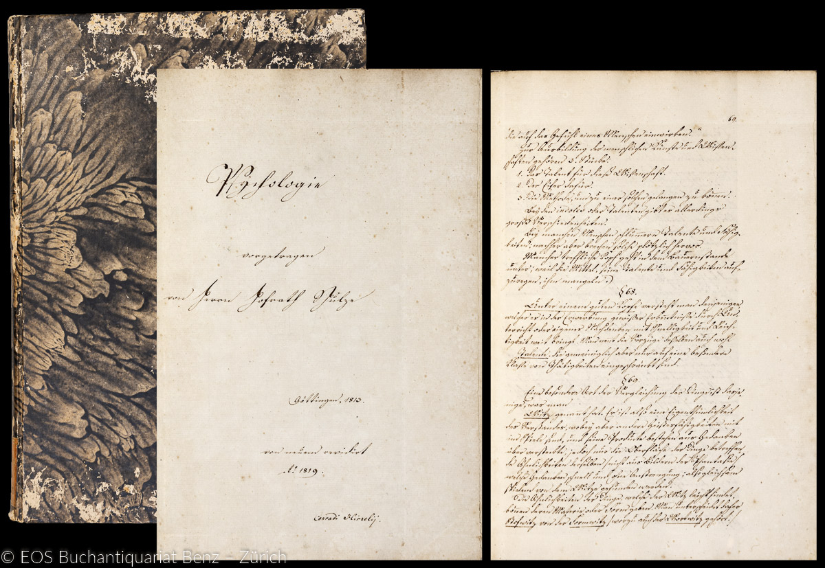 Manuskript. – Schulze, Hofrath: Psychologie vorgetragen von Herrn Hofrath Schulze. Göttingen, 1813. 4°. (1) Bl., 185 S. Pappband der Zeit.