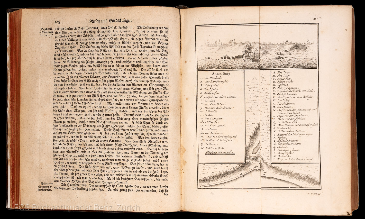 Schwabe, Johann Joachim (Hrsg.): Allgemeine Historie der Reisen zu Wasser und Lande. Oder Sammlung aller Reisebeschreibungen, welche bis itzo in verschiedenen Sprachen von allen Völkern herausgegeben worden, und einen vollständigen Begriff von der neuern Erdbeschreibung und Geschichte machen : Worinnen der wirkliche Zustand aller Nationen vorgestellet, und das Merkwürdigste, Nützlichste und Wahrhaftigste in Europa, Asia, Africa und America … enthalten ist. Mit nöthigen Landkarten … und mancherley Abbildungen der Städte, Küsten, Aussichten, Thiere, Gewächse, Kleidungen … versehen. Leipzig, Arksteee und Merkus. 1758 16. Band. (12), 736, (34) S. Mit 29 (davon 17 gef.) Tafeln, davon 18 Karten. Lederband der Zeit mit restauriertem Rücken.