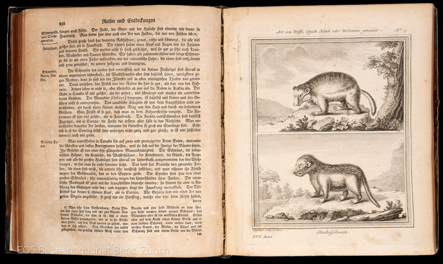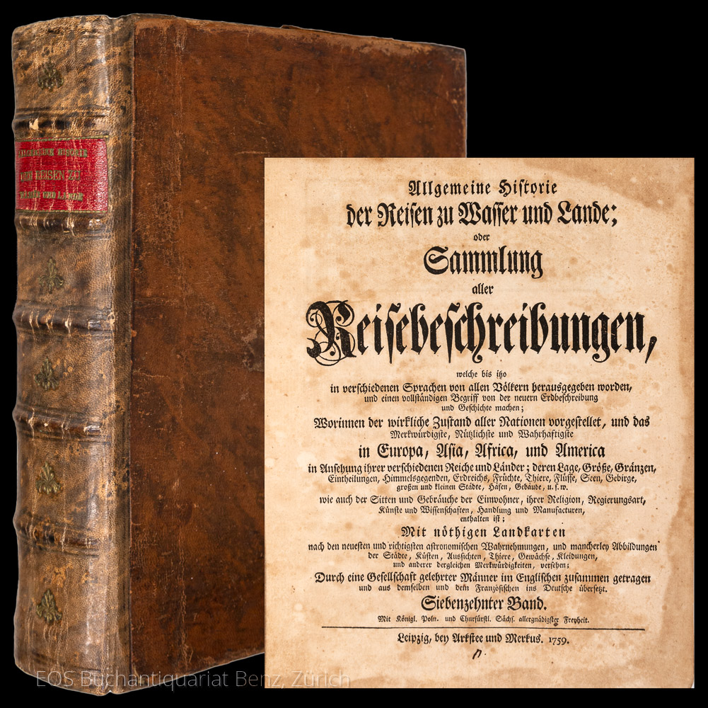 Schwabe, Johann Joachim, Hrsg.: Allgemeine Historie der Reisen zu Wasser und zu Lande, oder Sammlung aller Reisebeschreibungen (…) worinnen der wirkliche Zustand aller Nationen vorgestellet, und das Merkwürdigste, Nützlichste und Wahrhaftigste in Europa, Asia, Africa und America (…) Oder Sammlung aller Reisebeschreibungen, welche bis itzo in verschiedenen Sprachen von allen Völkern herausgegeben worden, und einen vollständigen Begriff von der neuern Erdbeschreibung und Geschichte machen : Worinnen der wirkliche Zustand aller Nationen vorgestellet, und das Merkwürdigste, Nützlichste und Wahrhaftigste in Europa, Asia, Africa und America … enthalten ist. Mit nöthigen Landkarten … und mancherley Abbildungen der Städte, Küsten, Aussichten, Thiere, Gewächse, Kleidungen … versehen. Leipzig, Arkstee und Merkus, 1759. 17. Band. 4°. (1) Bl., (8) 726 (42) S., (1) Bl. Mit 17 (dv. 12 gef.) gest. Karten u. 11 gest. Tafeln. Lederband der Zeit mit restauriertem Rücken, schlichte Vergoldung und Rückenschild.