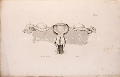 Seiler, Burkhard Wilhelm: Die Gebärmutter und das Ei des Menschen in den ersten Schwangerschaftsmonaten nach der Natur dargestellt. Dresden, Walthersche Hofbuchhandlung, 1832. Gross-4°. (4) 38 S. Mit 12 (davon 2 kol.) gest. Tafeln von J. F. Schröter. Lose Bogen in Orig.-Pappumschlag mit mont. Deckelschild und textiler Schliesse.