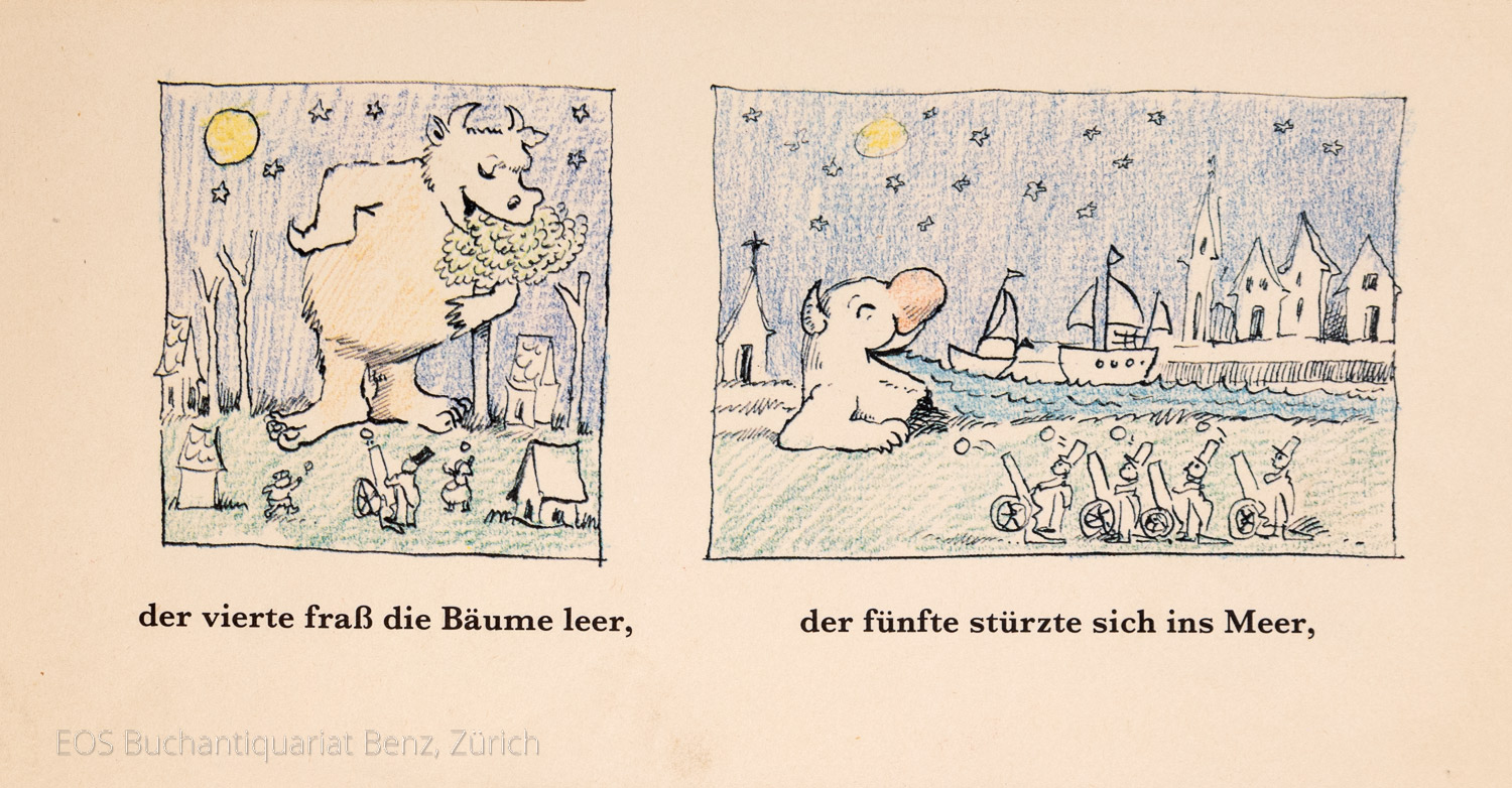 Sendak, Maurice:  Die Geschichte von den sieben kleinen Riesen. Aus dem englishcen übersetzt: The Story of the Seven Little Giants. Zürich, Diogenes, 1975. (10) Blatt mit farbigen Illustrationen von Maurice Sendak Illustrierte Broschur mit Fadenheftung.