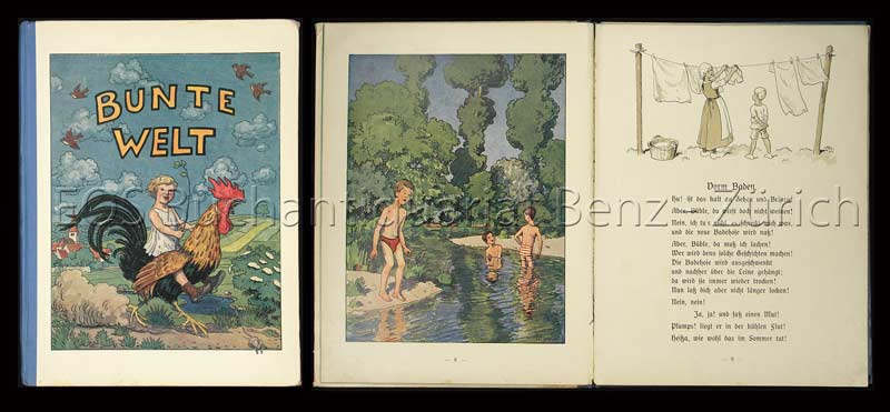 Sergel, Albert: Bunte Welt! Gedichte für Buben und Mädel. Reutlingen, Ensslin & Laiblins, 1911. 4°. 32 S. Mit zum Teil ganzs. farb. Bildern von Hans von Volkman und (Lied-)Kompositionen von Engelbert Humperdinck. Farb. illustr. Orig.-Halbleinenband.