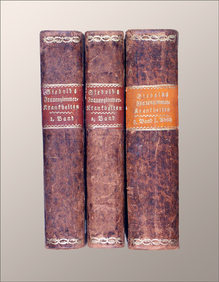 Siebold, (Adam) Elias von: Handbuch zur Erkenntniss und Heilung der Frauenzimmerkrankheiten. Frankfurt a.M., Varrentrapp und Sohn, 1811-1826. 2 in 3 Bänden. 8°. XVIV, 594 S., 1 n.n. Bl. Verbesserungen; VI, 566 S.; XXXVIII, 752 S. Lederbände der Zeit mit goldgeprägten Rückenschildern und einfacher Rüchenvergoldung.