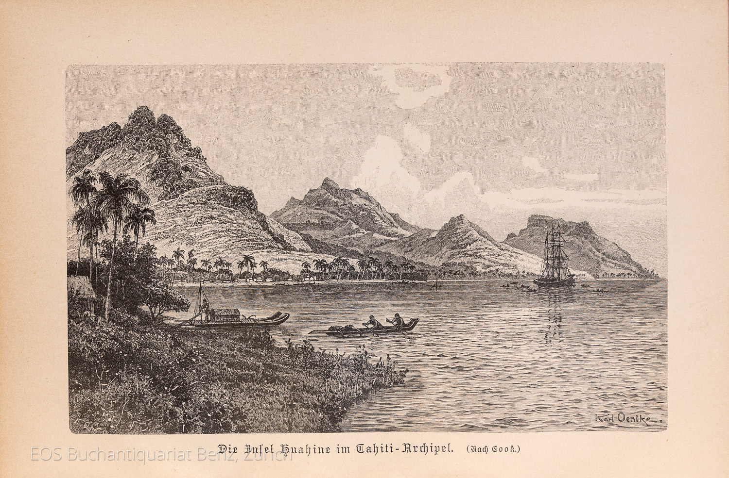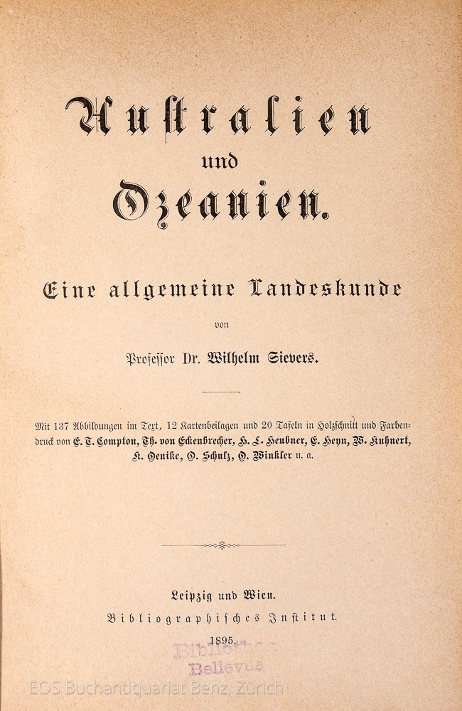 Sievers, Wilhelm: Australien und Ozeanien. Leipzig u. Wien, Bibliographisches Institut, 1895. 8°. VIII, 521 S. Mit einer Porträt-Tafel, 12 farb. Karten (davon 7 doppelblattgrosse) und 19 Tafeln (davon 8 chormolithogr.). Halblederband der Zeit.