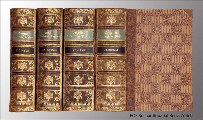 Smollet, Tobias George: Roderich Random. Hrsg. von Marianne Trebitsch-Stein / Peregrine Pickle. Nach der W.Ch.S. Myliusschen Übersetzung hrsg. von Rudolf Kurtz München, Leipzig, Georg Müller, 1914 u. 1917. 2 u. 4 Bde. in 4 Bdn. 8°. LX, 493 S.; (8) 508 S.; XII, 320 (1) S., (1) 378 (1) S.; (6) 358 (1) S., 339 (1) S. Orig.-Halblederbände mit goldgeprägtem Rücken (leicht berieben und bestossen). = „Bücher der Abtei Thelem“, Bände 13, 14, 15 u. 16.