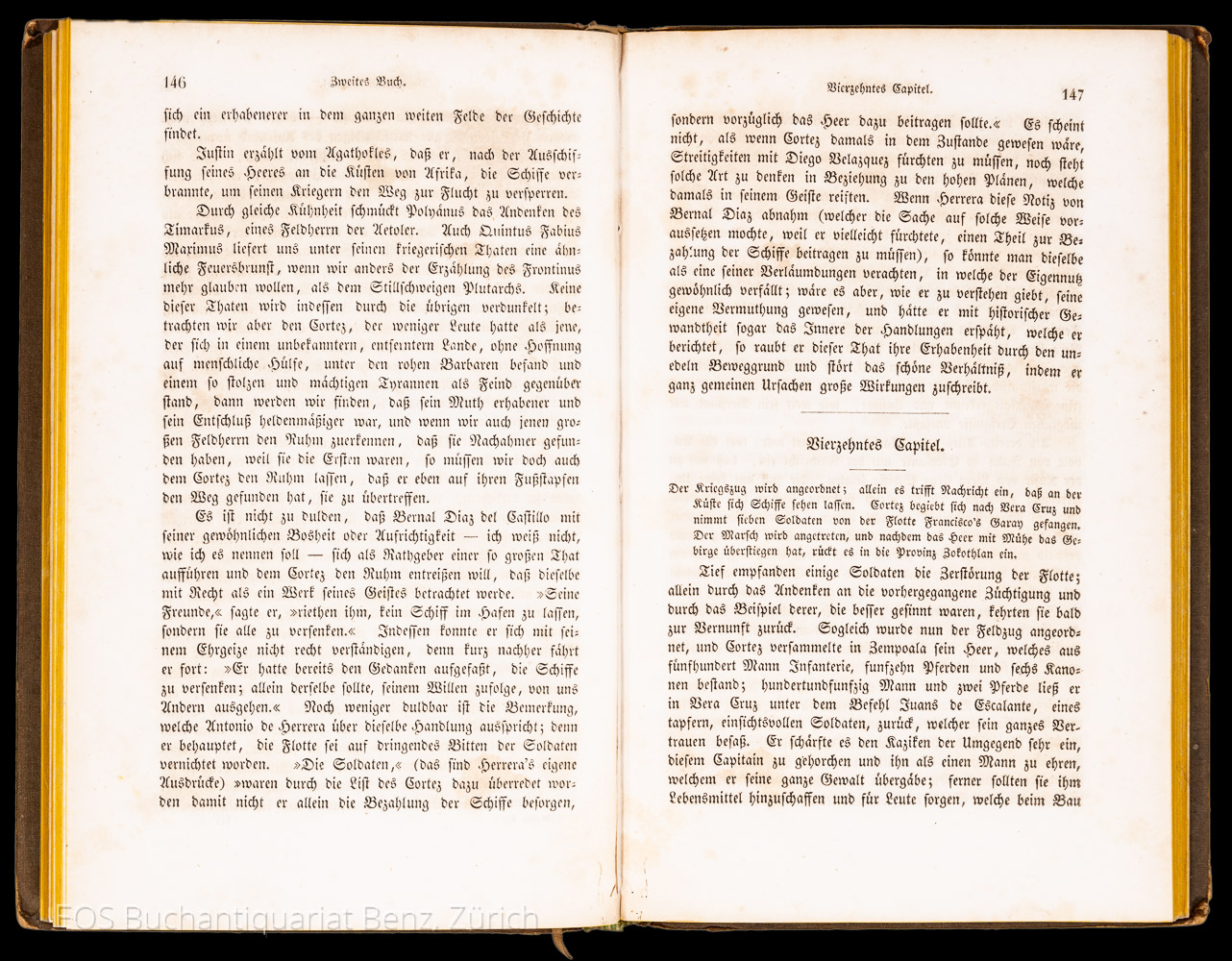 Solis, Don Antonio de:  Geschichte der Eroberung von Mexiko. Aus dem Spanischen übersetzt von L. G. Förster. Quedlinburg u. Leipzig, Gottfr. Basse, 1838. 2 Bände. 8°. VIII, 324 S. (dv. 3 S. Anzeigen); 320 S. (dv. 6 S. Anzeigen). Leinenbände der Zeit.