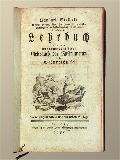 Steidele, Raphael: Lehrbuch von dem unvermeidentlichen Gebrauch der Instrumente in der Geburtshülfe. Neue umgearbeitete und vermehrte Auflage. Wien, Johann David Hörling 1785. 338 S., 1 Bl. Inhalt. Mit einer gestochenen Titelvignette und einer mehrfach gefalteten gestochenen Tafel. Halblederband der Zeit mit rotem Rückenschild und reicher Rückenvergoldung.