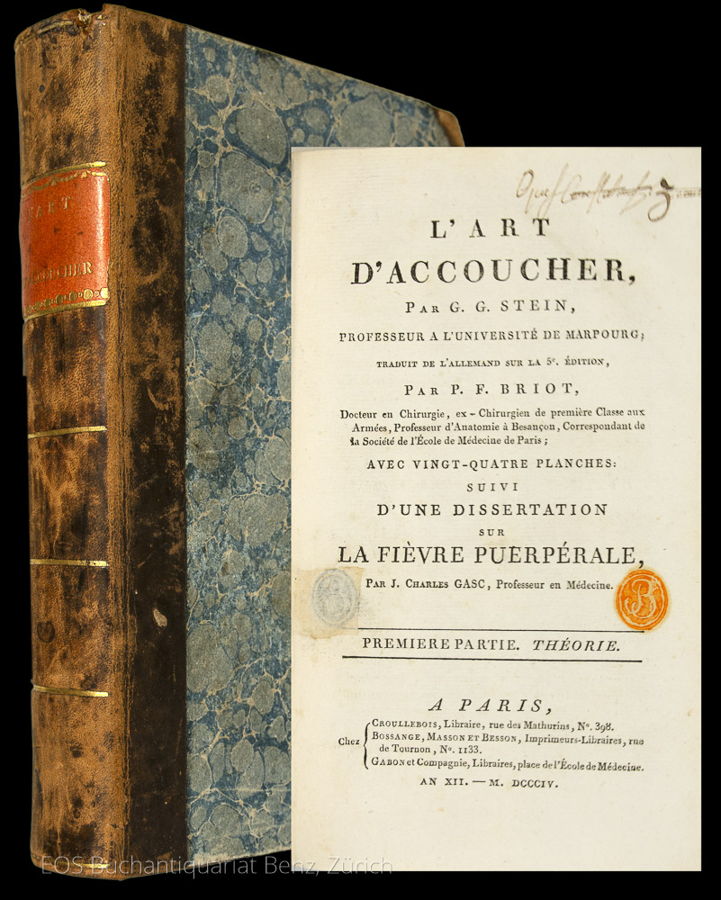 Stein, Georg Wilhelm der Ältere:  L’art d’accoucher. Traduit de l’allemand sur la 5e. édition par P(ierre) F(rançois) Briots, suivi d’une dissertation sur la fièvre puerpérale par J. Charles Gasc. Paris, Croullebois, Bossange, Gabon, 1804. 2 in einem Band. 8°. 2 Bl., LXIII S., 157 S.; 2 Bl., 291 S. Mit 24 gefalteten, gestochenen Kupfertafeln. Halblederband der Zeit mit schlichter Rückenvergoldung und rotem Rückenschild.