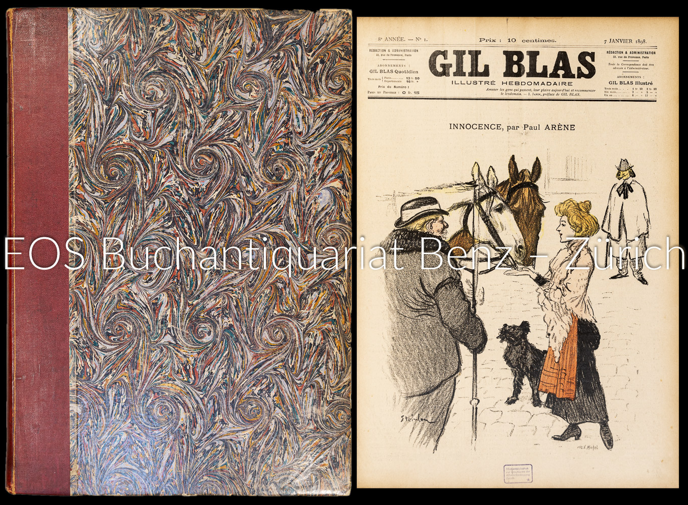 Vicaire III, 978. – Jahrgänge 1–11 dieser schönen Zeitschrift der Jahrhundertwende mit Texten von Baudelaire, S. Bernardt, Bruant, Colette, Daudet, France, Maupassant, Schwob, Mallarmé, Verlaine, Zola und anderen Autoren. Die meisten Illustrationen stammen von Steinlen. Ohne die Nr. 44 aus Jahrgang 10. Vorgebunden sind 2 Vorläufernummern des Gil Blas. (Sprache: Französisch / Français / French)