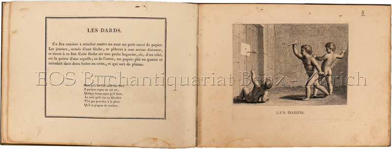 Vgl. Brunet V, 529, zur Orig.-Ausgabe. – Seltene Ausgabe aus dem frühen19. Jhdt.; sie bietet eine Auswahl von zwölf Blättern aus der Ausgabe 1657, zu der Claudine Bouzonnet Stella (1636-1697), die Nichte von Jacques Stella (1596-1657), die Stiche verfertigte. Diese sind hier nachgestochen von Alexandre Chaponnier (oder Chaponnière, 1753-1805) aus Genf, tätig in Paris, einem Meister der Punktiermanier. Die Tafeln zeigen nackte Knaben beim Spiel, z.B. Fechten, Pfeilwerfen, Armbrustschiessen, Schaukeln, Lacrosse u.a. – Leicht gebräunt, etwas fleckig, kl. Wasserrand unten, brauner Abklatsch und Tintenspritzer auf Taf. 3. – The pictures show the following games: The show: La Marelle a Cloche-Pied, Les petits feux, L’escrime, Les Dards, La Crosse, L’Escarpolete, L’Arbalête, La Course du Pot, Le Collin Maillard, Le Traineau et Le Sabot. (Sprache: Deutsch / German)