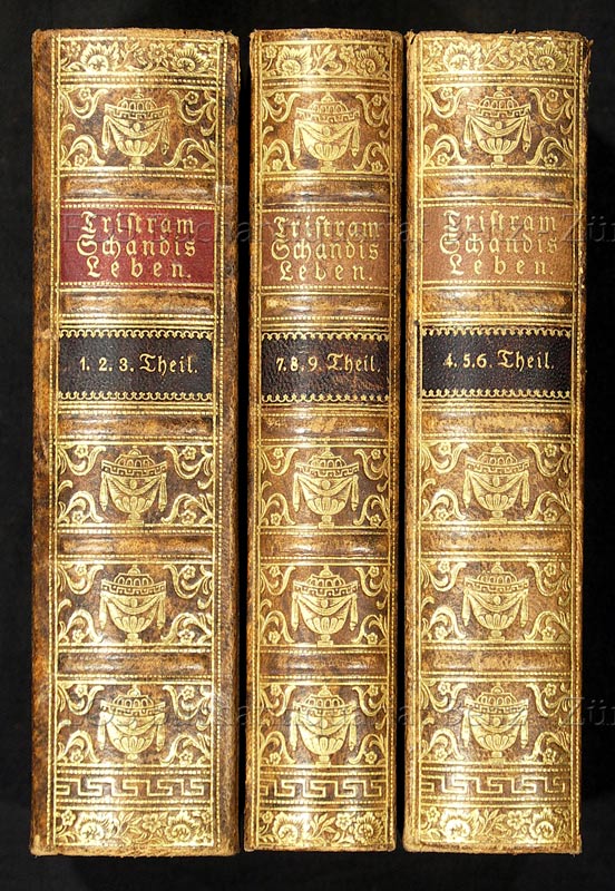 Sterne, Laurence:  Tristam Schandis Leben und Meynungen. München und Leipzig, Georg Müller, 1910. 9 Teile in 3 Bänden. 8°. Halblederbände der Zeit mit reicher Rückenvergoldung.