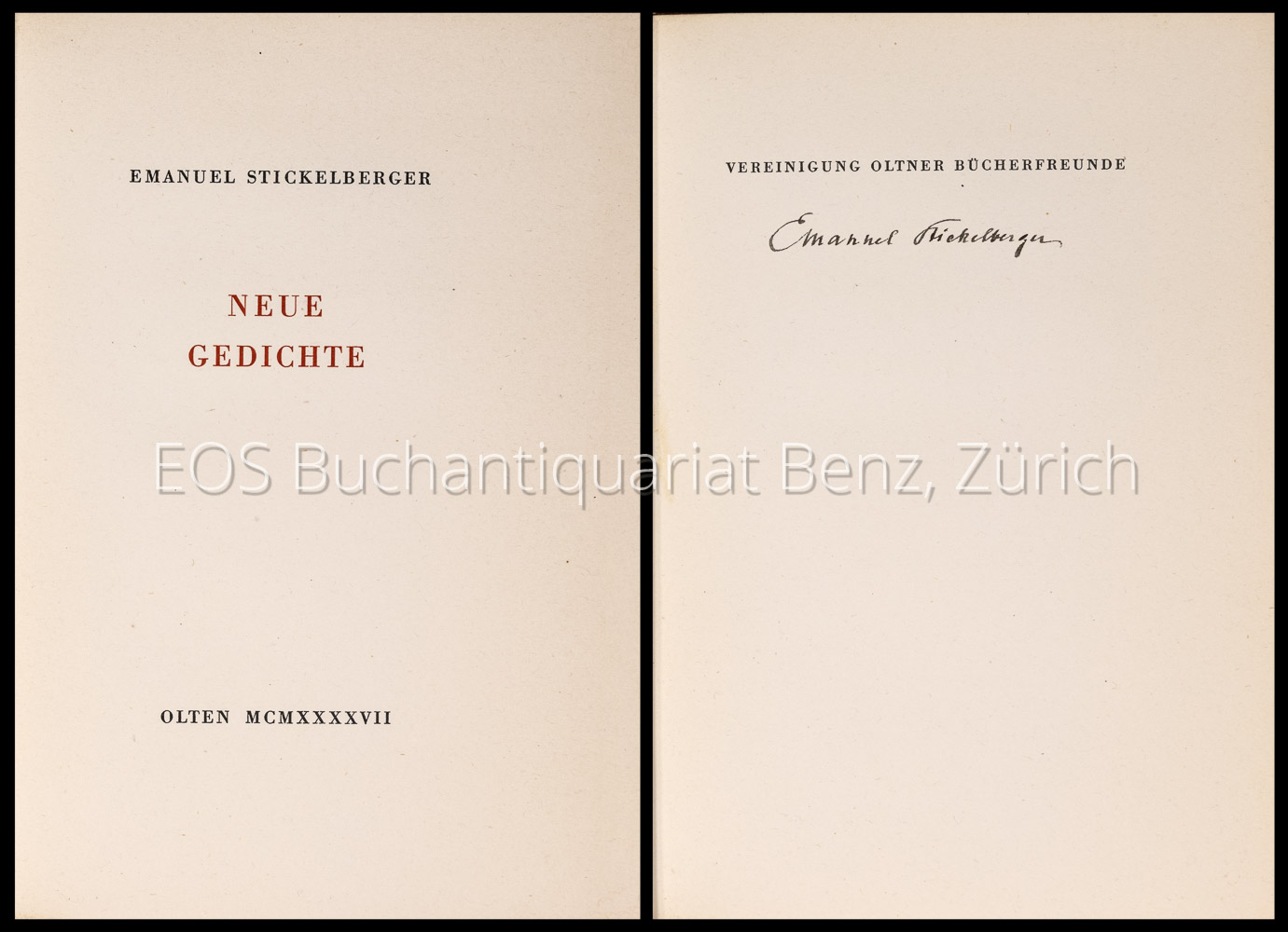 Stickelberger, Emanuel: Neue Gedichte. Olten, Vereinigung Oltener Bücherfreunde, 1947. 8°. (3) Bl., 64 (8) S., 3 Bl. Orig.-Halblederband in Schuber.