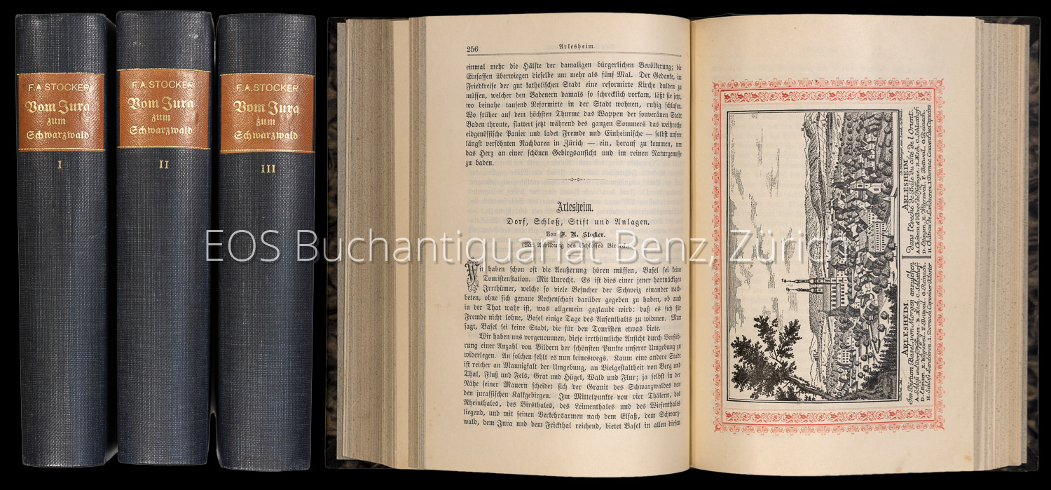 Stocker, F. A. (Hrsg.): Vom Jura zum Schwarzwald. Geschichte, Sage, Land und Leute. Herausgegeben unter Mitwirkung einer Anzahl Schriftsteller und Volksfreunde. Aarau, H. R. Sauerländer, 1884. 9 in 3 Bänden. Gross-8°. (4) IV, 320 S.; (3) 320 S., (4) 319 S.; (4) 320 S.; (4) 320 S.; (4) 320 S.; (4) 320 S.; (4) 320 S.; (4) 320 S. Mit einigen (dv. wenige ganzs.) Illustr.u. Karten Halbleinenbände der Zeit mit Rückenvergoldung. Gebrauchsspuren.