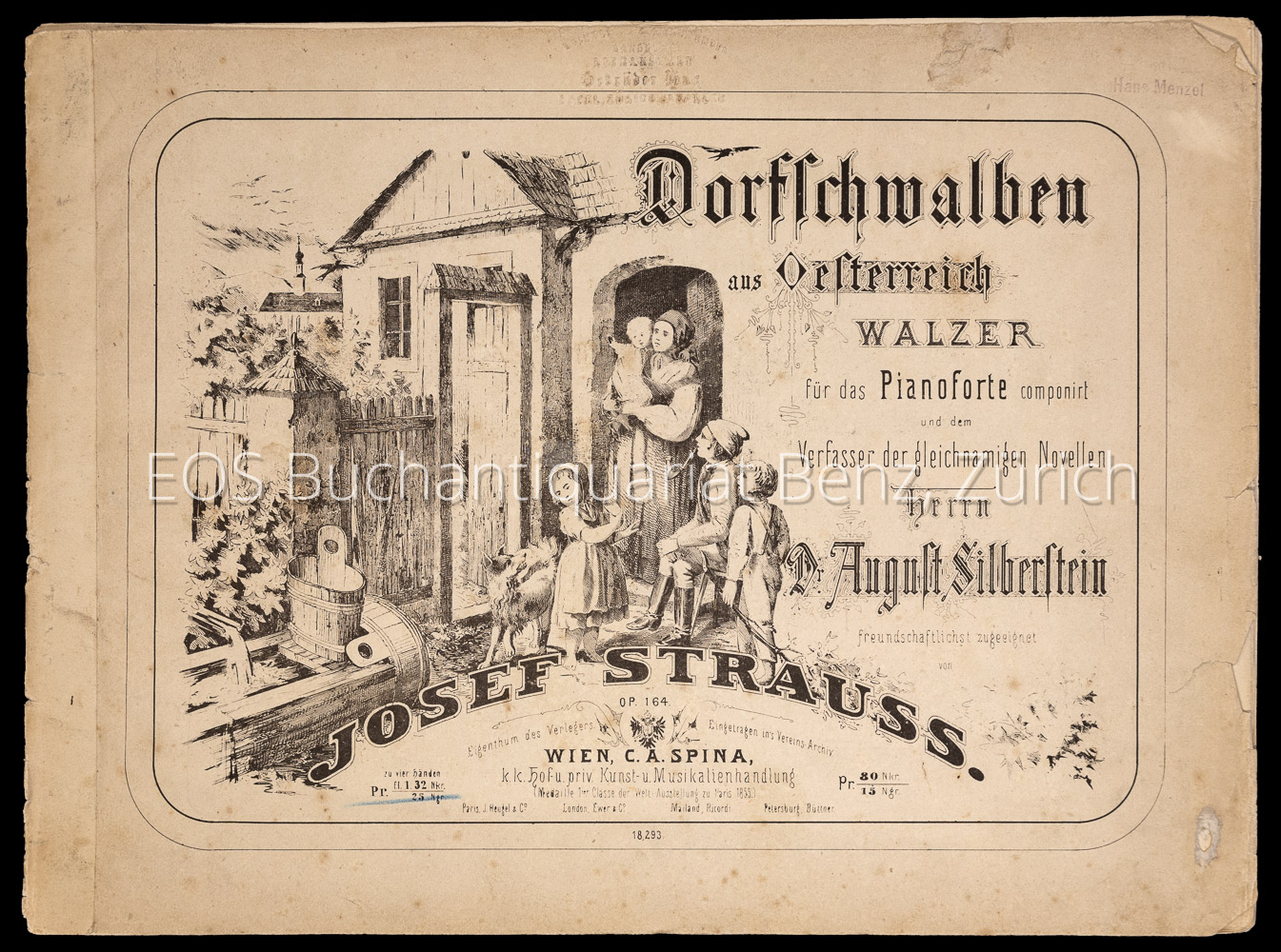 Strauss, Josef: Dorfschwalben aus Oesterreich. Op. 164. Walzer für das Pianoforte componirt und dem Verfasser der gleichnamigen Novellen Herrn August Silberstein freundschaftlichst zugeeignet. Wien, C. A. Spina, o. J. (um 1865). Quer-4°. 19 S. gestochene Noten und lithogr. Titelblatt. Illustr., lithogr. Orig.-Umschlag.