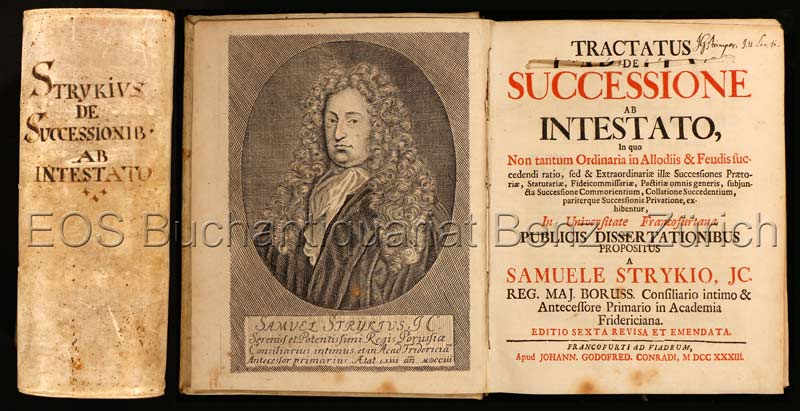 Stryk, Samuel: Tractatus de successione ab intestato. in quo non tantum ordinaria in allodiis & feudis succedendi ratio … exhibentur. Frankfurt a. O., Gotfried Conrad, 1733. Editio sexta, revisa et emendata. (3) Bl., 1256 S., (36) Bl. (Index). Mit 1 gest. Portrait und 2 gef. genealogischen Tafeln. Pergamentband der Zeit.