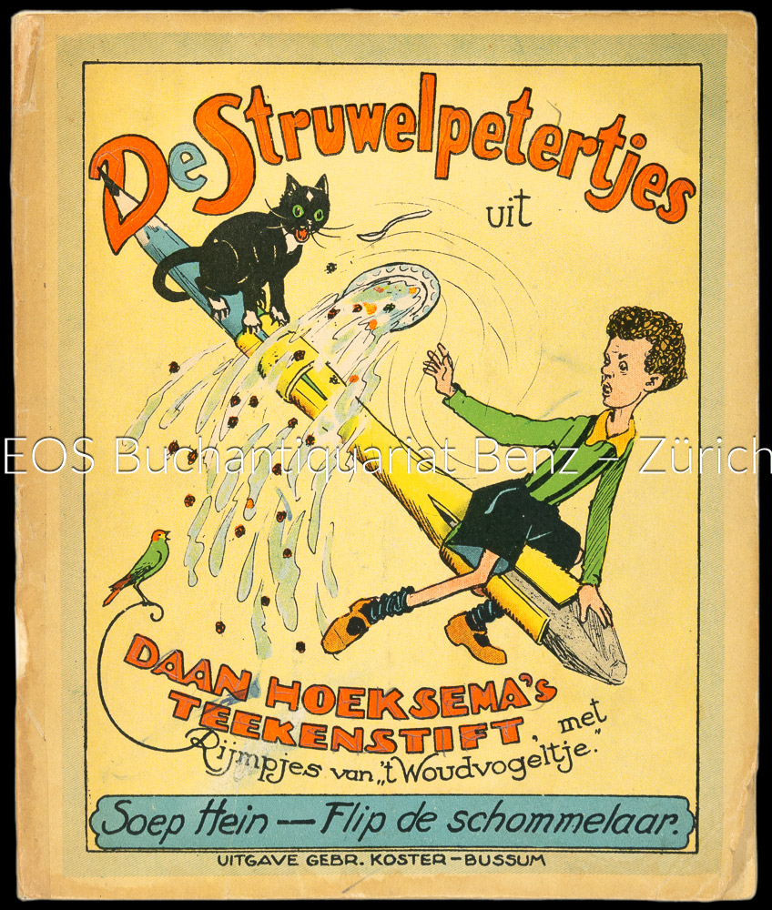 Struwwelpetriade. – t Woudvogeltje: De Struwelpetertjes mit Reimen (Rijmpjes) von t Woudvogeltje. Soep Hein – Flip de schooomelaar. Bussum, (1927), 8°. (8) Bl. mit Illustrationen von Daniël Hoeksema. Illustrierte Broschur mit Klammerheftung.