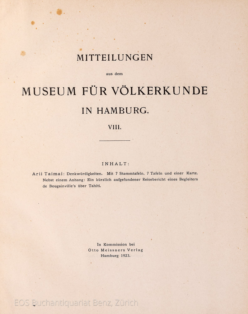 Taimai, Arii E.: Denkwürdigkeiten von Arii Taimai E – Marama von Eimeo -Teriirere von Tooarai, nebst einem Anhang: Ein kürzlich aufgefundener Reisebericht eines Begleiters de Bougainville’s über Tahiti. Hamburg, Meissner, 1923. 168 S. Mit 7 Tafeln und 1 Karte. Halbleinenband der Zeit mit Rückenschild.