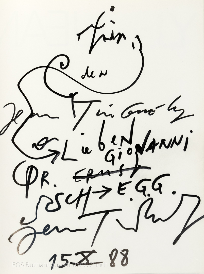 Ganzseitige Widmung mit schwarzem Filzstift: «Für den Lieben Giovanni Dr. Ernst Sche–> egg. Jean Tingueley 15 X 88». – Deutsch-englische Parallelausgabe. – Gut erhaltenes sauberes Exemplar. – Sehr gut erhaltenes Exemplar. Schutzumschlag mit Gebrauchsspuren. (Sprache: Deutsch / German – Englisch / English)