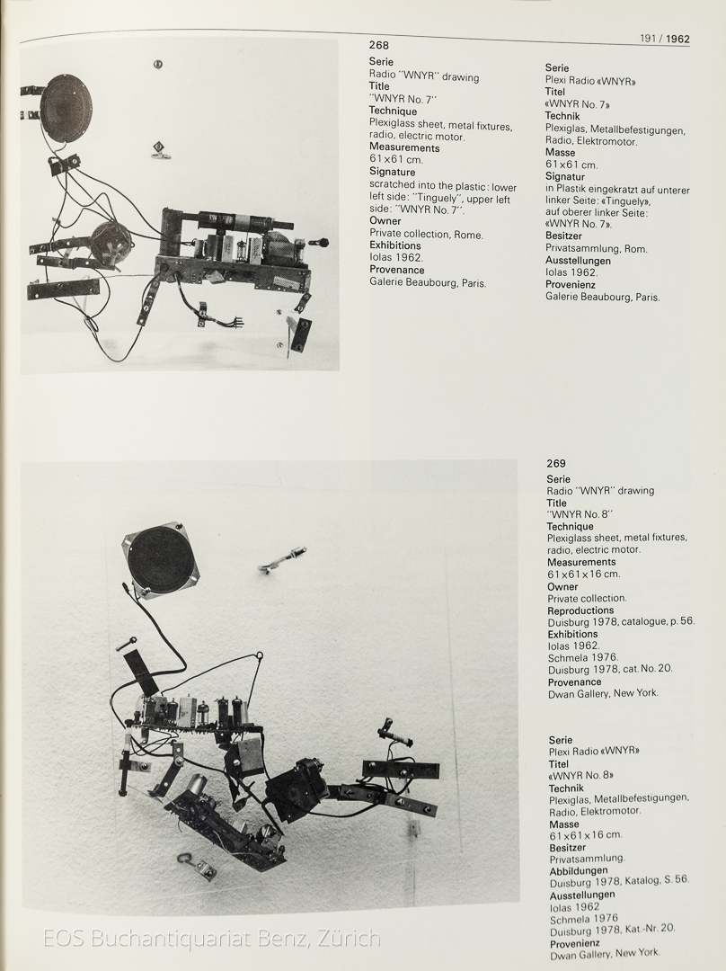Tinguely, Jean: Werkkatalog / Catalogue raisonné 1954–1968. Skulpturen und Reliefs / Sculpures and Reliefs. Küsnacht / Zürich, Galerie Bruno Bischofberger, 1982. 4°. 324 S. Mit 448 Werken mit Abb. Orig.-Leinenband mit Schutzumschlag.