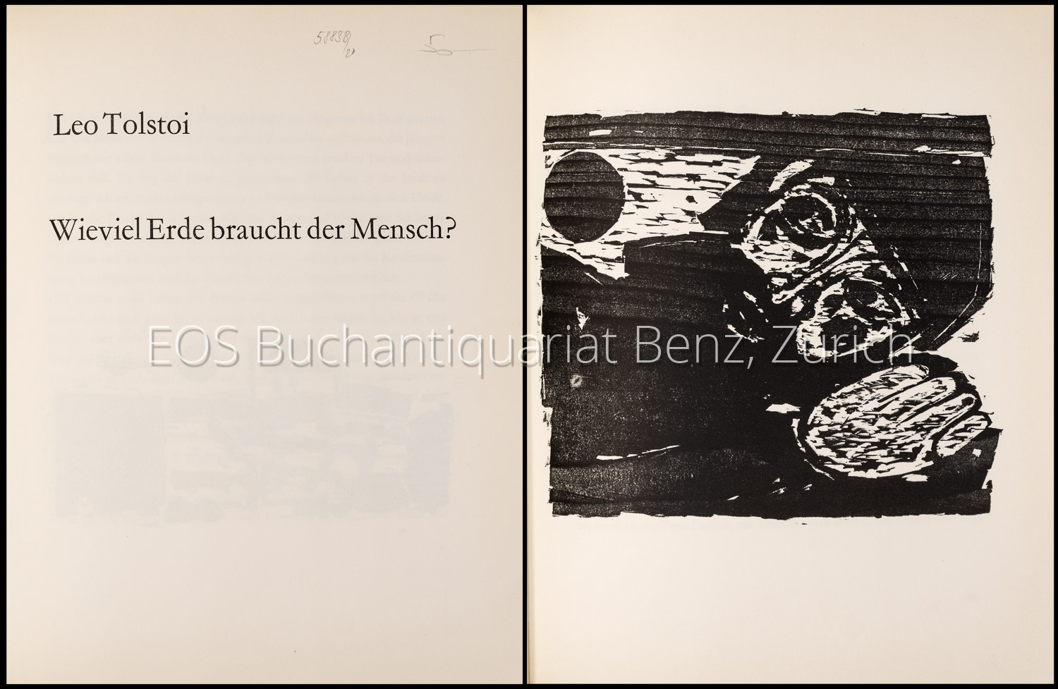 Tolstoi, Leo: Wieviel Erde braucht der Mensch? Zürich, Käser Presse, 1958. 4°. 36 S., 2 Bl. Mit 4 Holzschnitten von Fred Bauer. Orig.-Broschur.