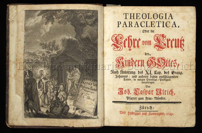 Ulrich, Johann Caspar: Theologia Paracletica, oder die Lehre vom Kreutz der Kinder Gottes, nach Anleitung des XI. Cap. der Evang. Johannis, und anderer dahin einschlagenden Texten, in einigen Dienstags-Predigten … Zürich, Heidegger u. Companie, 1749. 4°. (18), 763 S. Mit 1 gest. Frontisp. u. 1 Kupfer im Text. Halblederband der Zeit.