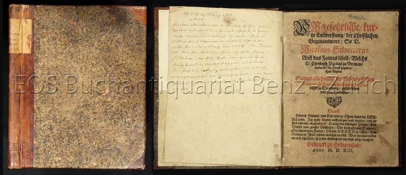 Ungefehrliche kurtze Entwerffung der Christlichen Gegenantwort, So D. Nicolaus Selneccerus auff das famos libell, welchs D. Christoph Pezelius zu Bremen wider jn in Druck gegeben thun köndte. Sampt Ablehnung der lügenhafftigen Relation, so Pezelius auch wider die Prediger zu Hamburg geschrieben und drucken lassen. Heiligenstad, 1591. Kl.-4°. (71) Bl., 1 leeres Bl. (A4 – S4). Etwas späterer Halblederband.