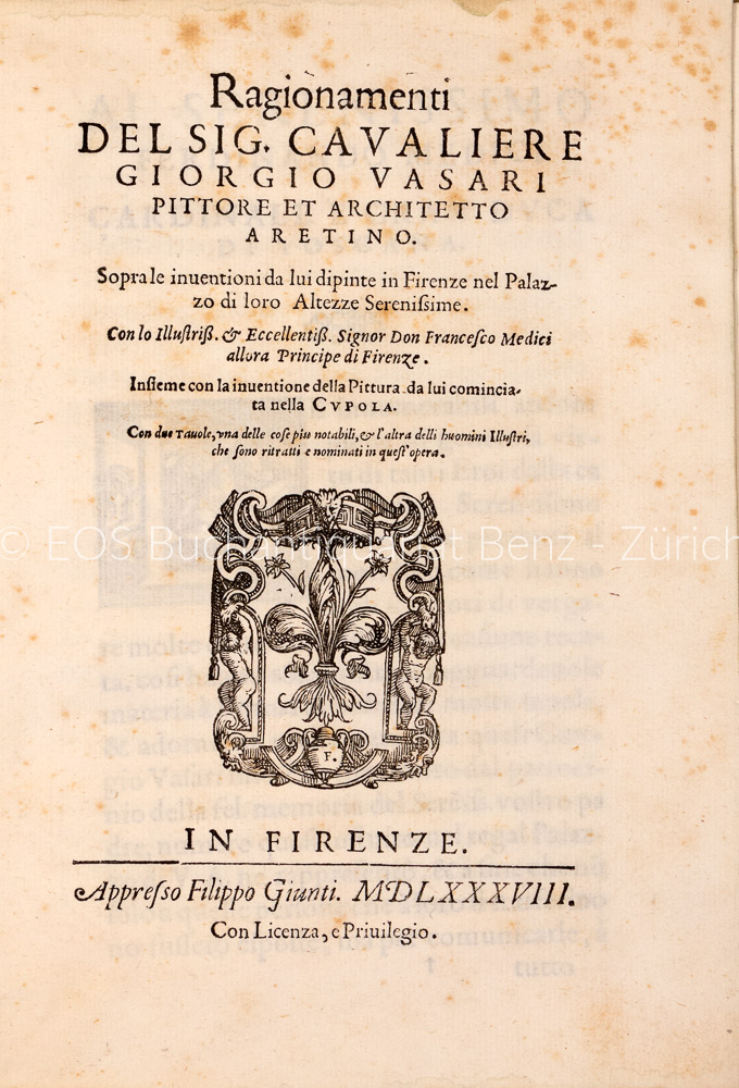 Brunet V, 1097. – Cicognara 225. – Erste Ausgabe. War schon 2 Jahre vor Giorgio Vasaris Tod (1511-1574) druckfertig, wurde vom gleichnamigen Neffen aus dem Nachlass herausgegeben. Die insgesamt sieben Dialoge, den einzelnen Sälen, mit Malereien von Vasari, im Palazzo Vecchio gewidmet, zwischen Vasari und Francesco Medici, dem damaligen «Principe» der Stadt Florenz.– Papier durchgehend stockfleckig. 7 Blatt stärker gebräunt. Der Einband leicht fleckig. (Sprache: Italienisch / Italiano / Italian)