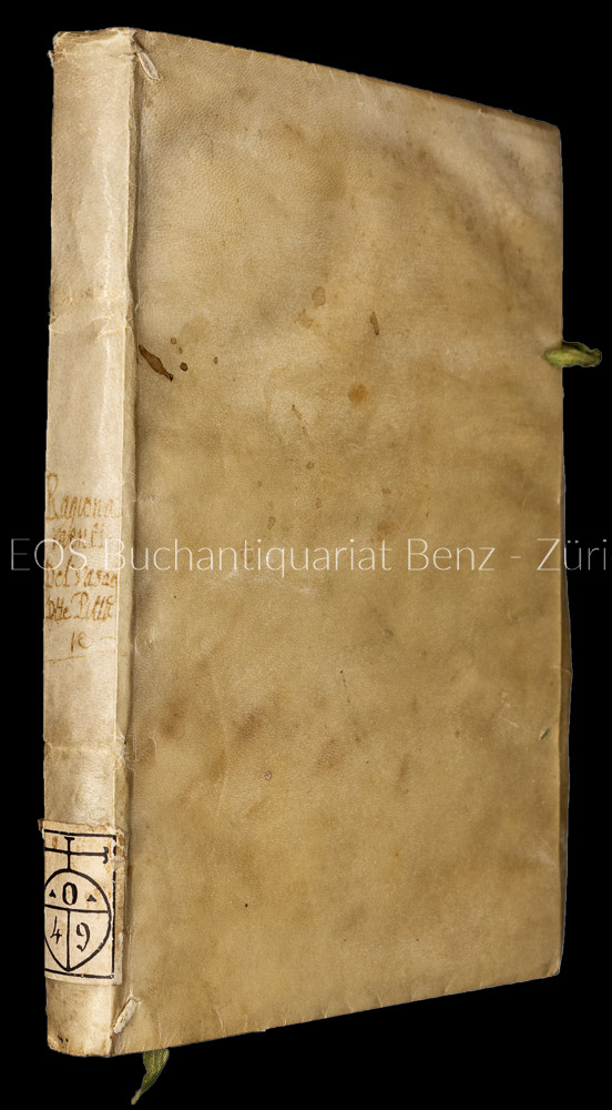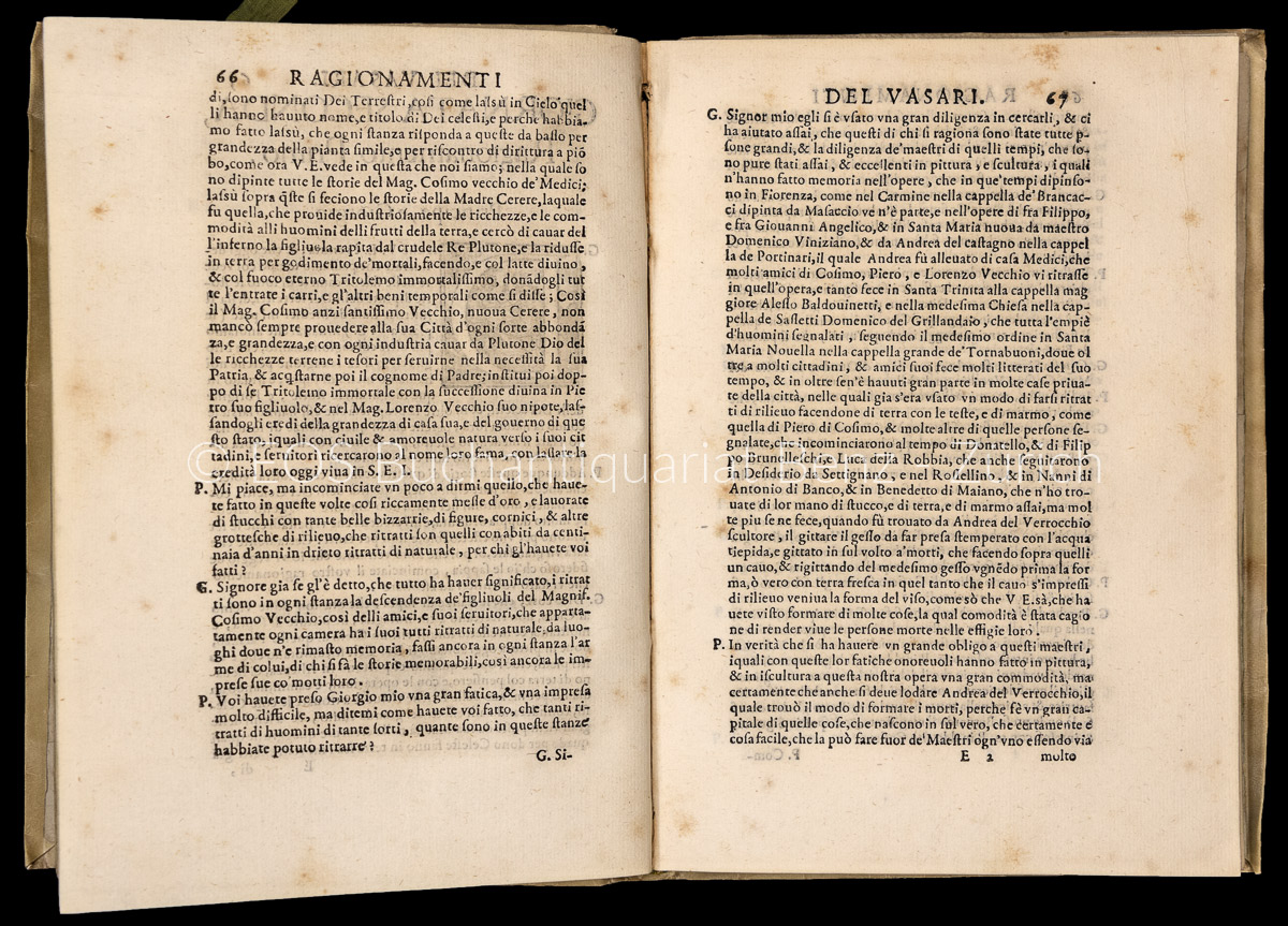 Vasari, Giorgio: Ragionamenti. Sopra le inventioni da lui dipinte in Firenze nel Palazzo di loro Altezze Serenissime. Con lo illustriss & Eccelentiss Signor Don Francesco Medici allora Principe di Firenze. Insieme con la inventione della Pittura da lui cominciata nella Cupola. Florenz, Filippo Giunti, 1588. Kl.-4°. (4) Bl., 186 S., (9) Bl. Mit Holzschnitt-Portrait, 2 versch. Holzschnittdruckermarken und zahlr. Holzschnitt-Initialen. Flexibler Pergamentband der Zeit mit 2 Schliessbändern (2 Seiten ausgerissen), handschr. Rückentitel und Papierrückenschild.