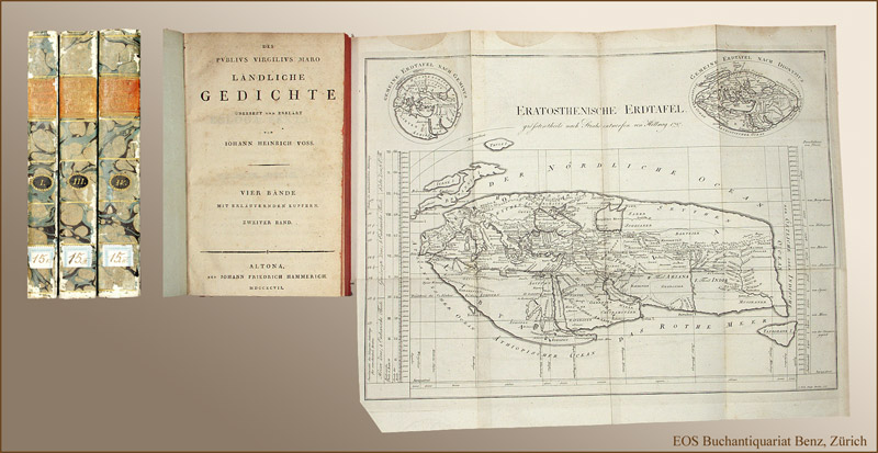 WG 1542, 19. Zweisprachige, reich kommentierte Ausgabe des bekanntesten Homer-Uebersetzers. Enthält Vergils Werke“Bucolicon“ (Zehn erlesene Idyllen) u. „Georgicon“ (Landbau). Die Karte von C. Jäck zeigt die „Erotosthenische Erdtafel“, die Tafel verschiedene Pflugformen. – Vorsätze mit kl., zur Hälfte getilgtem Eintrag von alter Hand. Durchgehend gebräunt.