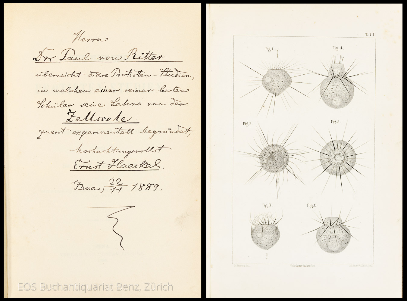 Mit handschr. Widmung von Ernst Haeckel an «Herrn Dr. Paul von Ritter, überreicht diese Protisten-Studien, in welchen einer seiner besten Schüler seine Lehre von der Zellseele zuerst experimentell begründet, hochachtungsvoll Ernst Haeckel, Jena 22/11 1889». – Das Papier durchgehend leicht gebräunt. Der (Sprache: Deutsch / German)