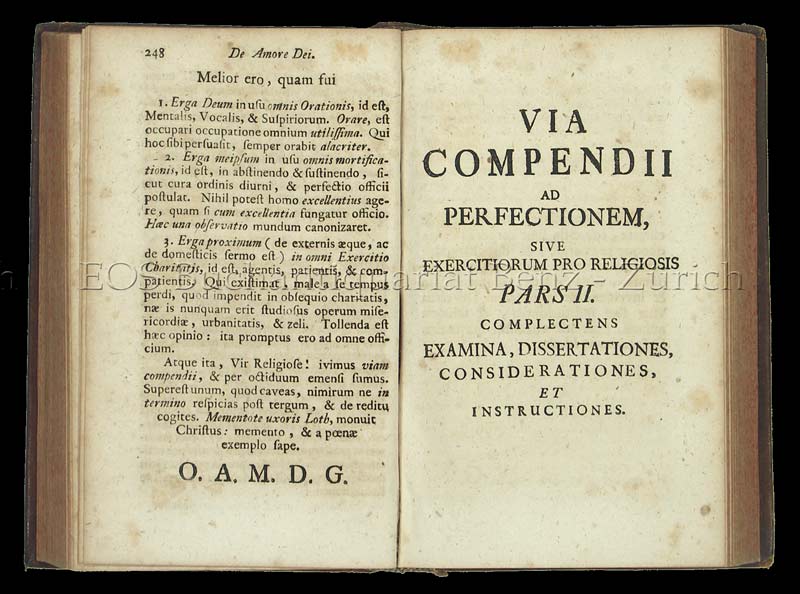 Via compendii ad perfectionem statui religioso competentem octiduano itenere emetienda duce S. Ignatio de Lojola interprete P. Francisco Neumayr. – Pars prima. Meditationes. – (Pars II. Complectens, examina, dissertationes, considertiones, et instrudtiones). Augsburg, München u. Ingolstadt Crätz u. Summer, 1757. 8°. (20) Bl., 248 S., 280 S. Mit 1 Titelholzschnittvignette. Lederband der Zeit mit Rückensch.