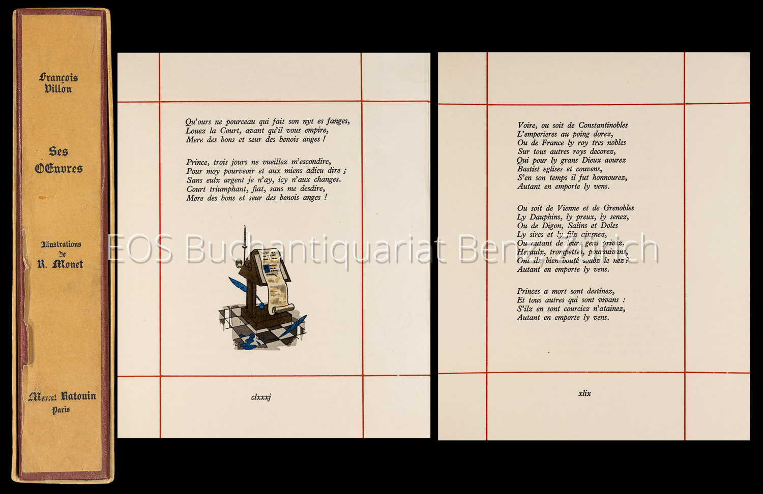Villon, François: Le grand testament Villon et le petit, son codicille et ses ballades nouvellement illustré par Robert Monet. Paris, Ratouin, 1948. Mit 45 farb. Illustr. von Robert Monet. Lose Bogen in Umschlag, Pappumschlag und Schuber.