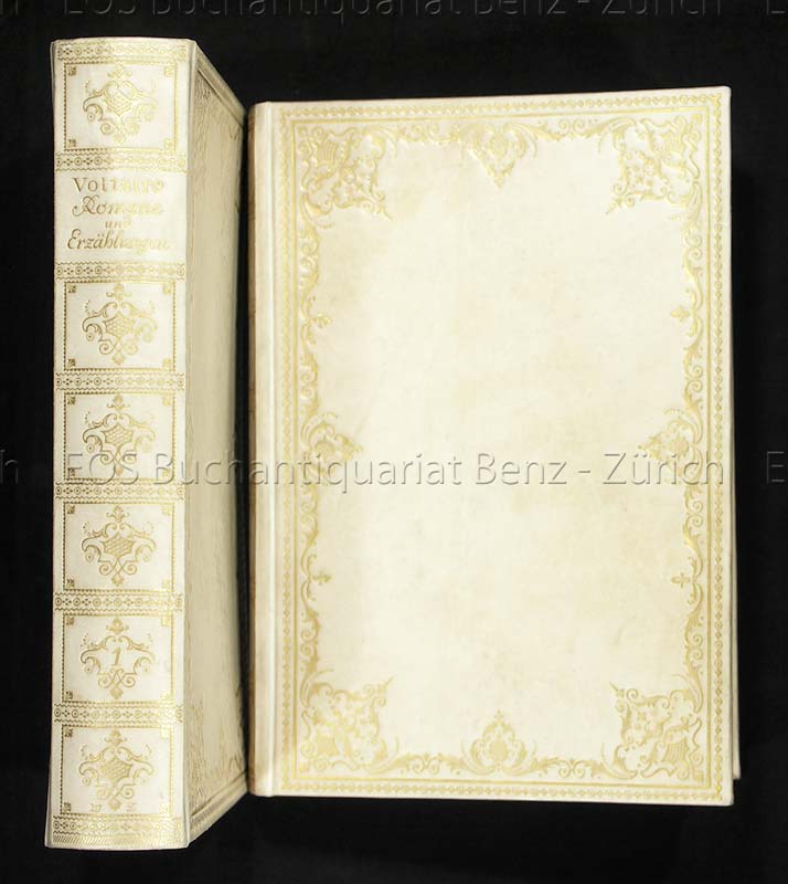Voltaire, (François-Marie Arouet):  Die Romane und Erzählungen. Vollständige Ausgabe. Berlin, Gustav Kiepenheuer, 1919. 2 Bände. Mit Illustrationen von Moreau Le Jeune nach alten Vorlagen. Orig.-Pergamentbande mit reicher Rücken- und Deckelvergoldung sowie Kopfgoldschnitt.