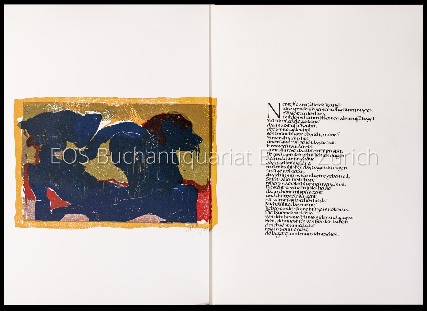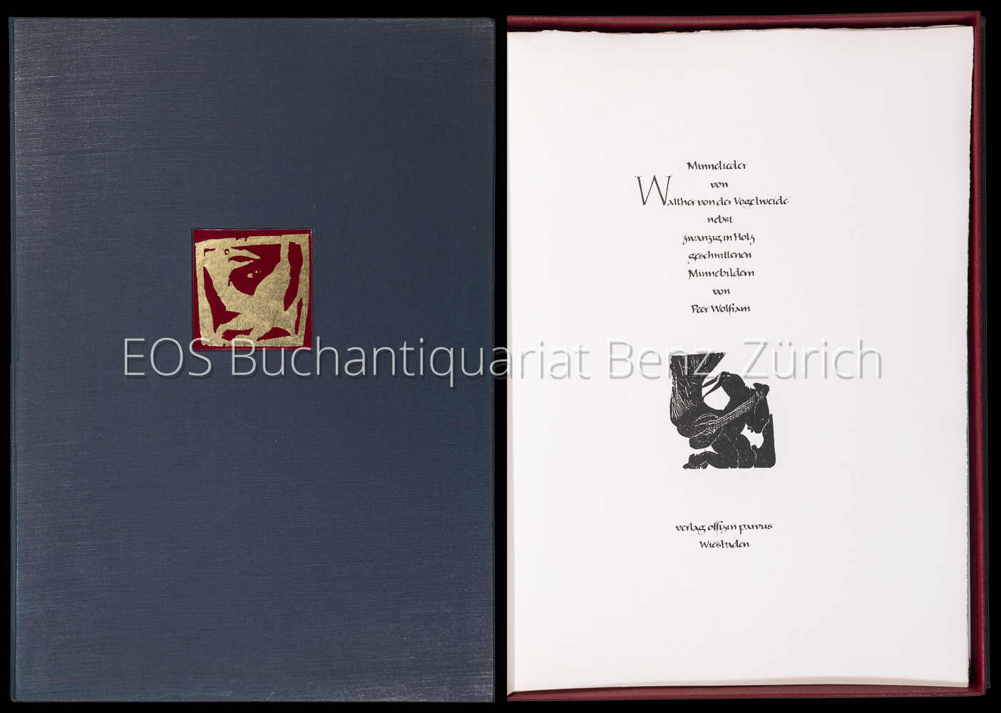 Walther: Minnelieder. Von Walther von der Vogelweide. Wiesbaden, Offizin Parvus, [1966]. Nebst zwanzig in Holz geschnittenen Minnebildern von Peer Wolfram. Folio. 44 Blatt. Mit 20 signierten s/w und farbigen Holzschnitten von Peer Wolfram. Lose Blätter in Leinekassette.