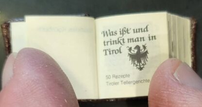 Das kleinste Kochbuch der Welt.-  Was ißt und trinkt man in Tirol. 50 Rezepte Tiroler Tellergerichte. 1985. 2. Auflage. 20 x 20 mm.5 214 S. mit sieben Illustrationen. Geprägter Lederband in Kunstlederschatulle.
