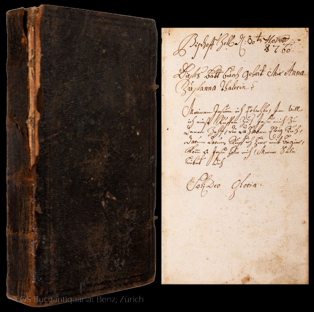 Wyss, Felix:  Hr. Felix Weyssen Christliches Bätt-Buch, Für Allerley Nothwendigkeiten Leibs und der Seelen. Auf Unterschidliche Zeiten, Zufähle, sonderbare Ständ und Persohnen gerichtet … Zürich, Johann Heinrich Bürckli, 1740. 8°. 455 S. Mit einem Porträt und 8 Kupfertafeln. Lederband auf Holzdeckeln der Zeit mit 2 Metall-Lederschliessen.